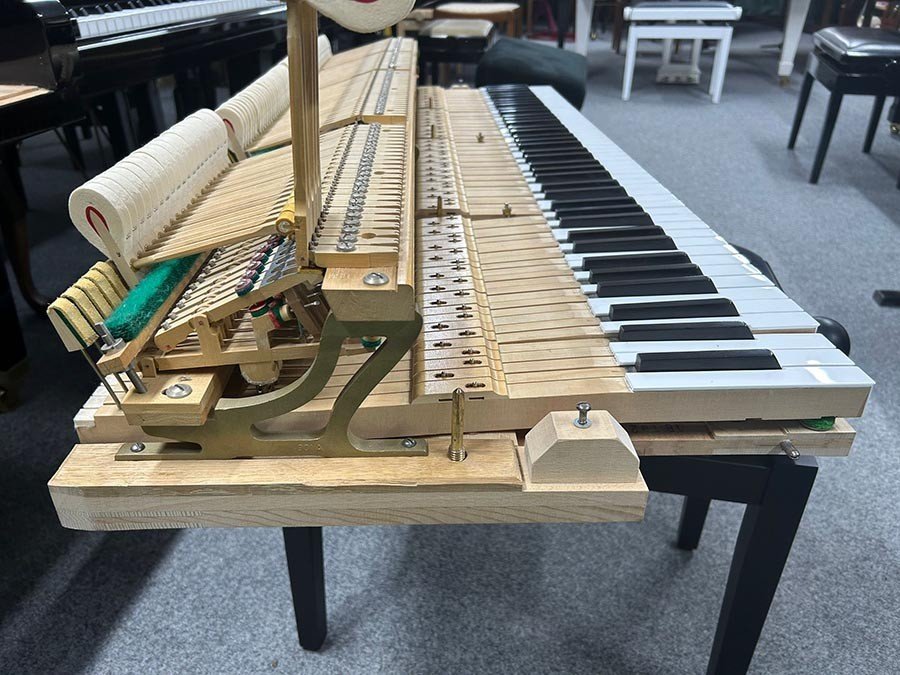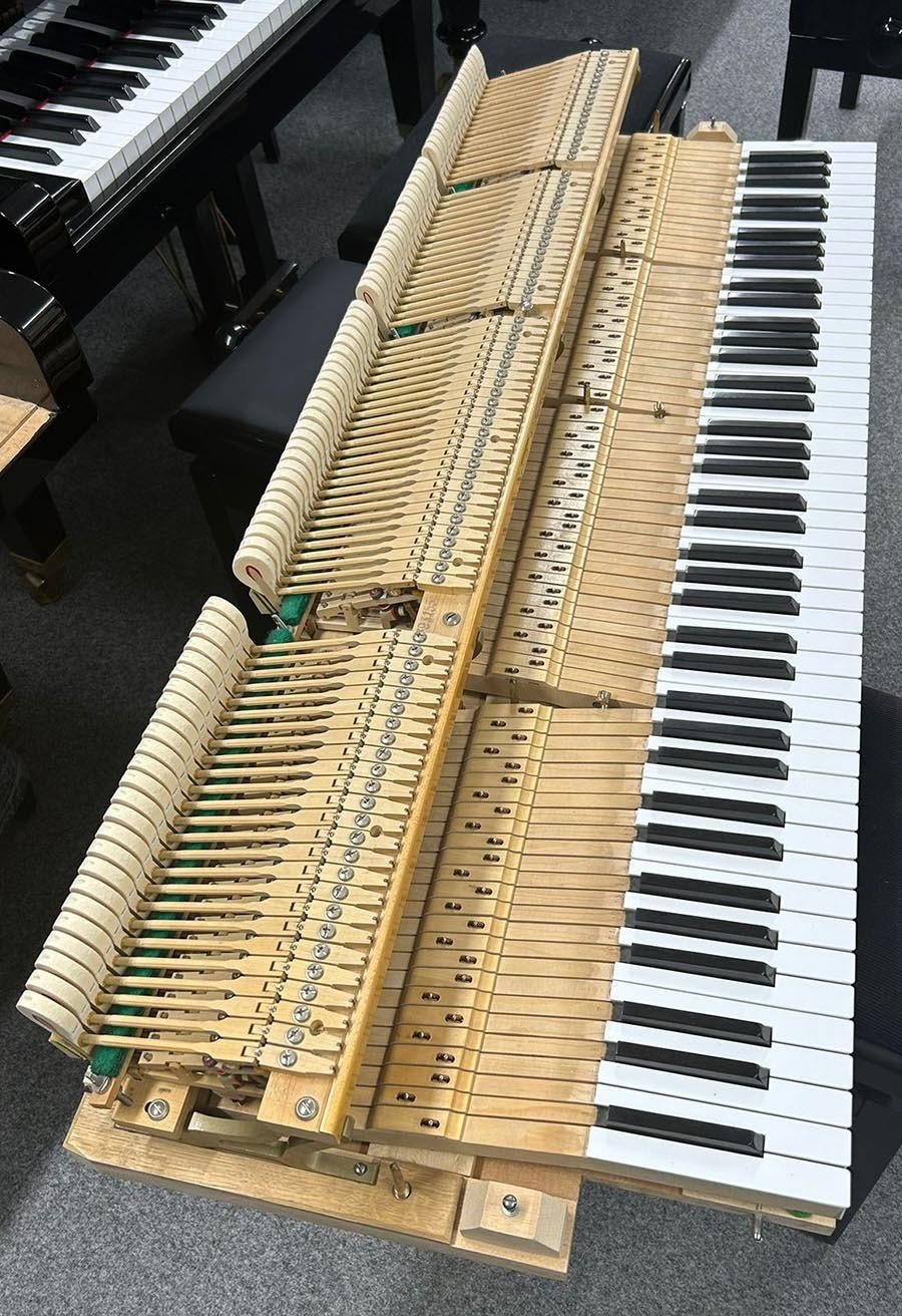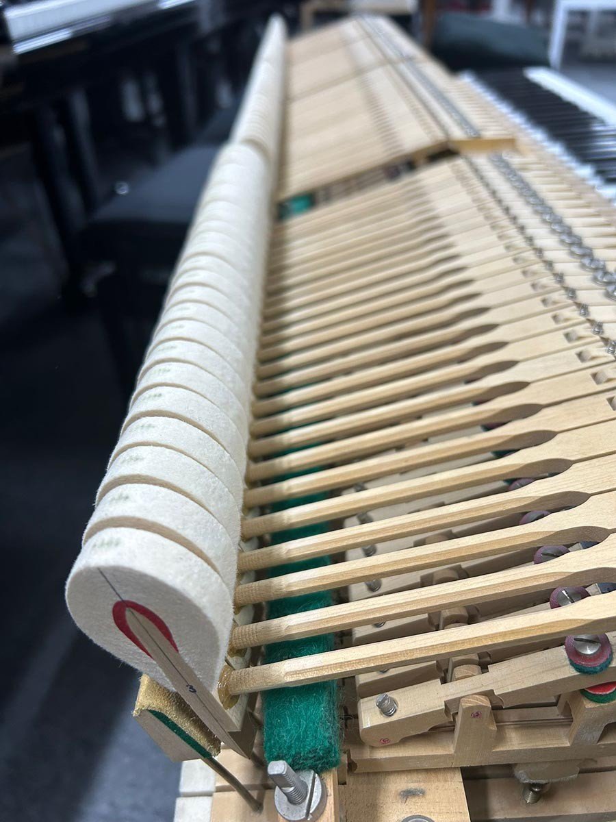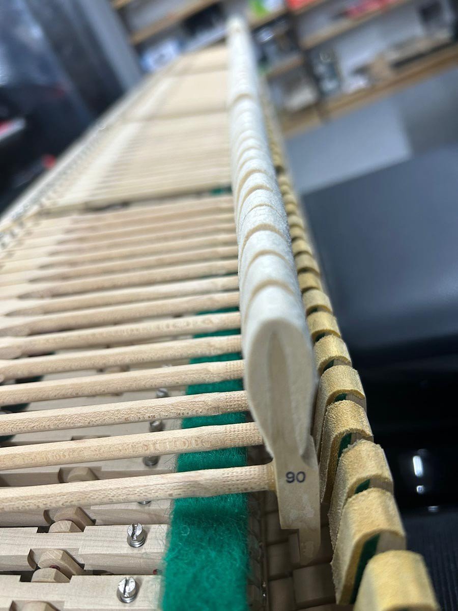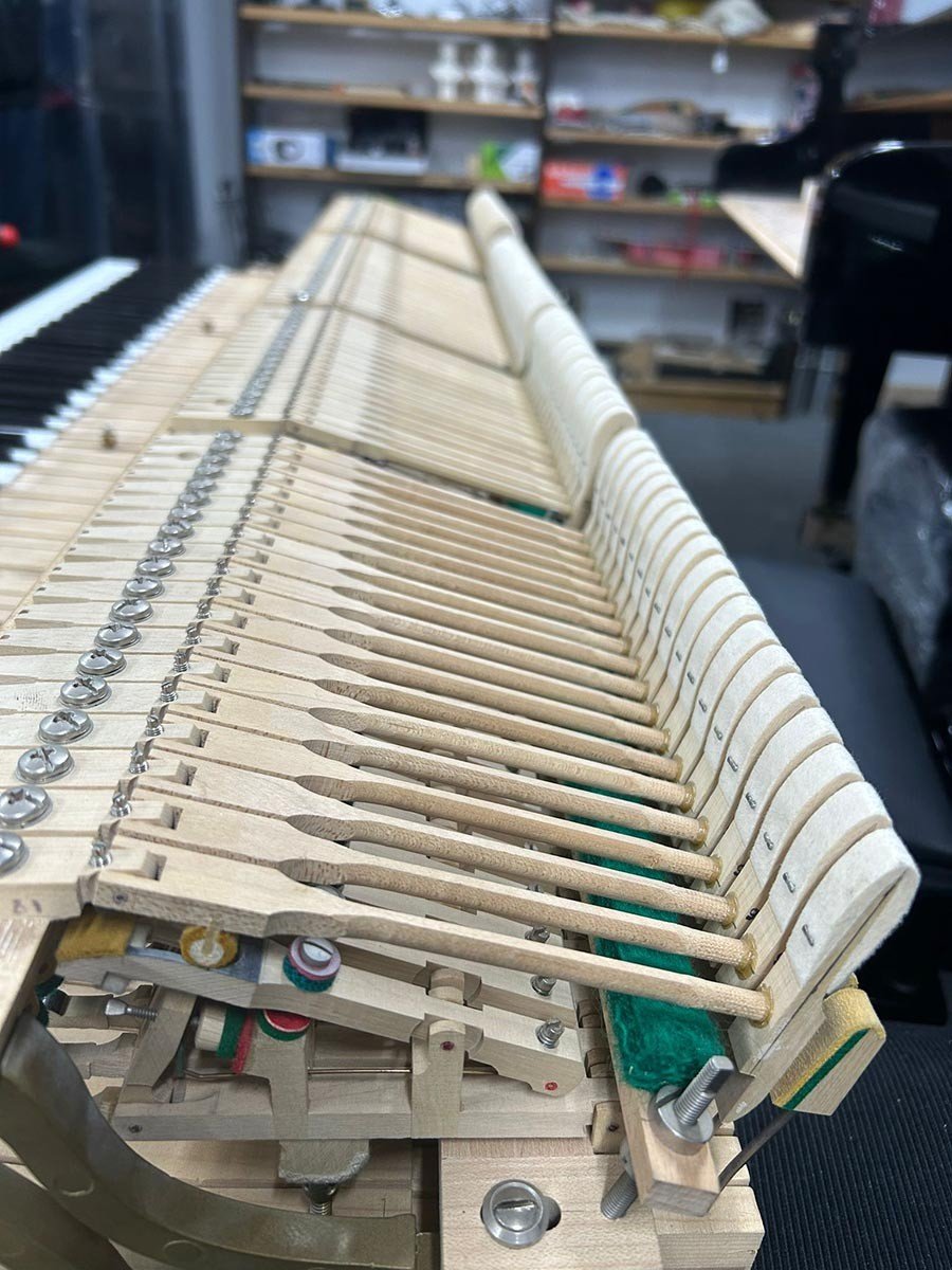 Um ein angenehmes Spielgefühl zu ermöglichen wurden die Tasten gerade gelegt und die Mechanik umfassend und nach allen Regeln des Klavierbaus reguliert.