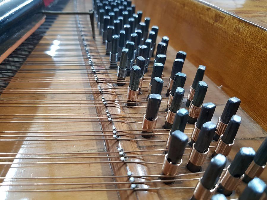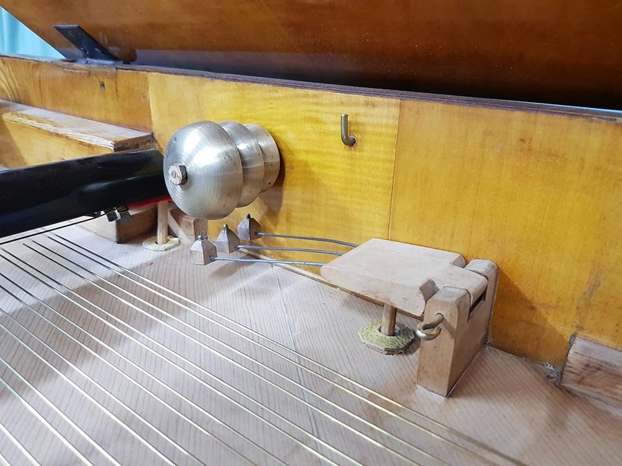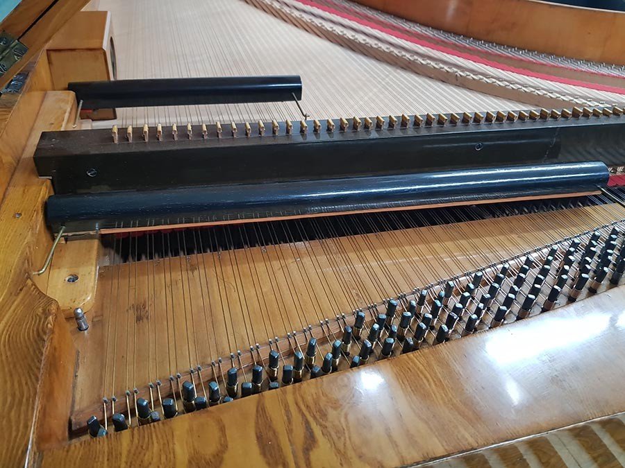 Wir haben die Mensur basierend auf den originalen Saiten unter Berücksichtigung der maximalen Belastung neu berechnet. Der Flügel wurde mit historisch nachgefertigtem Saitenmaterial (Messing- und Bronzedraht im Bass, Eisendraht in Mittellage und Diskant) und unter Verwendung der originalen Stimmwirbel neu besaitet. Die Saiten wurden gleichmäßig und schrittweise auf die volle Spannung gebracht, um einseitigen Verzug des Instruments zu verhindern.