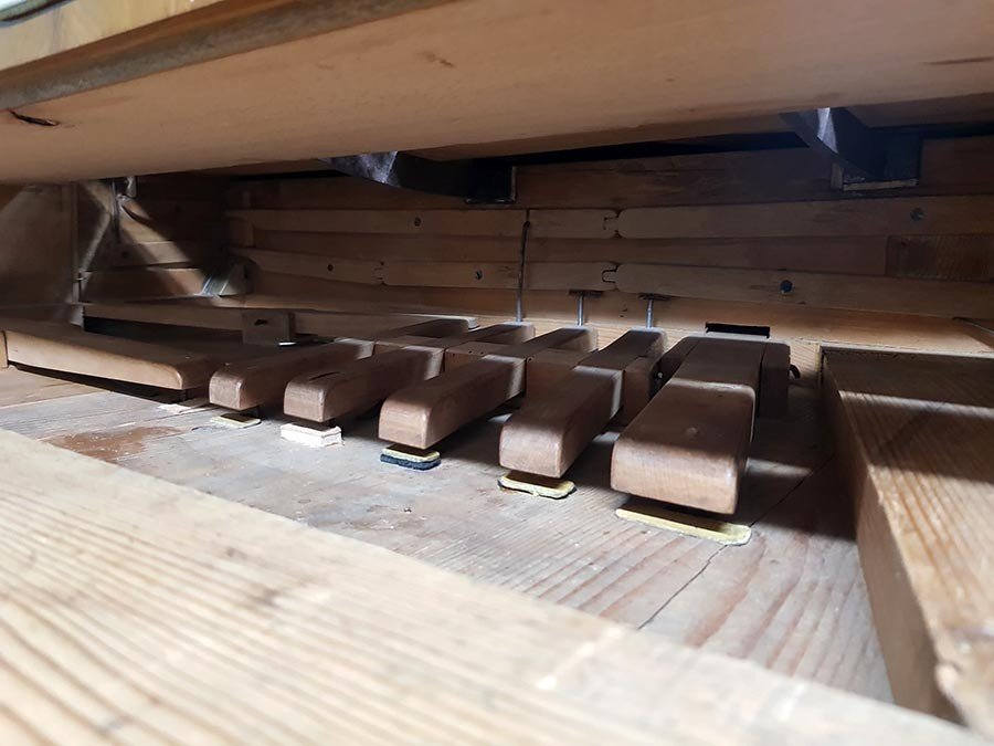 Das Hebelwerk der Pedale wurde gängig gemacht, der Fagottzug mit neuem Pergament/Leder/Stoff bezogen und alle Pedalfunktionen reguliert.