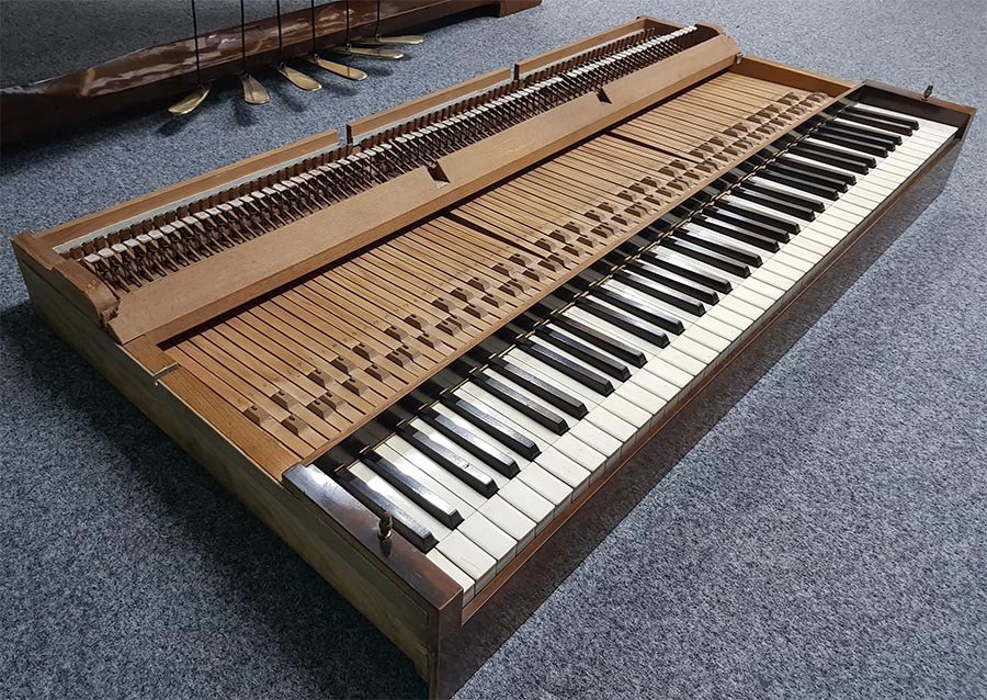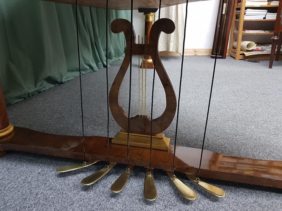 Die fehlende Lyra auf dem Pedalbrett haben wir neu angefertigt. Die Pedale wurden poliert und die Zugstangen neu lackiert.