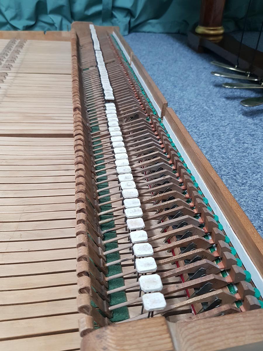 Die Mechanik und Klaviatur wurden komplett reguliert. Die Tasten gerade gelegt, der gleichmäßige Tiefgang reguliert. Die Hammerköpfe wurden auf die Saiten ausgerichtet, die Prellzungen und Auslösung reguliert sowie der Fang eingestellt.
