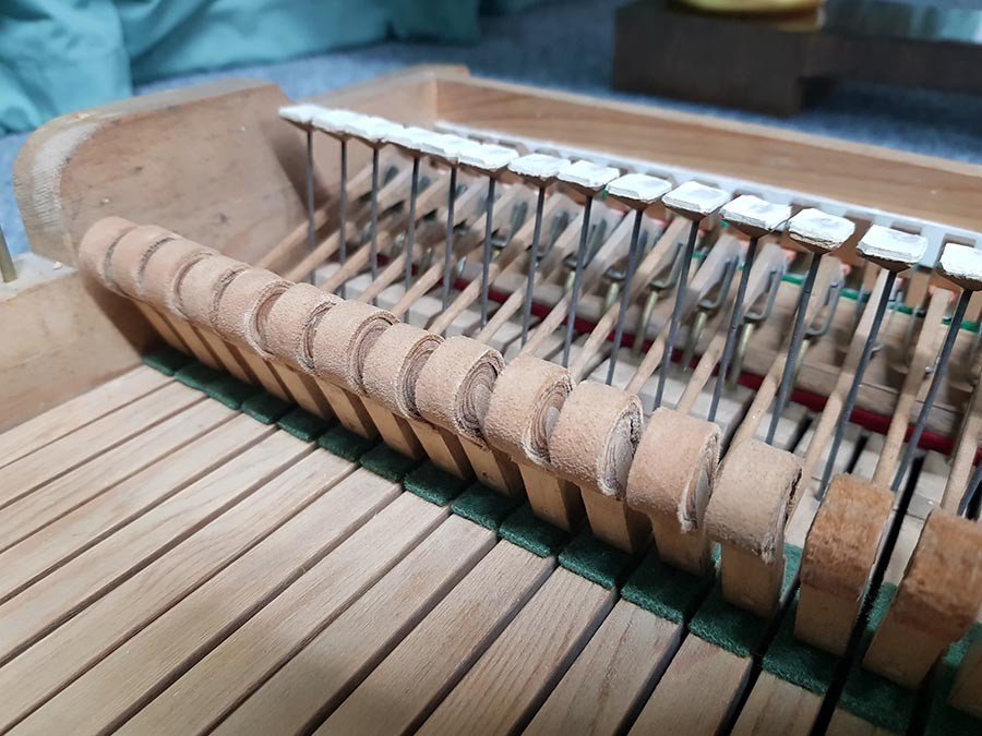 Bei einer früheren Reparatur wurde die oberste Lederschicht der Hammerköpfe ausgetauscht. Dieses war in gutem Zustand und musste daher nicht mehr erneuert werden. Gebrochene oder schlecht reparierte Hammerstiele wurden ausgetauscht, die verschlissenen Hammerruhepolster erneuert. Die Tastenvordergarnierungen aus Leder waren klapperig und hatten viel Spiel, daher haben wir sie ausgetauscht.