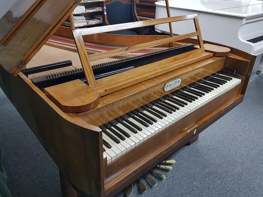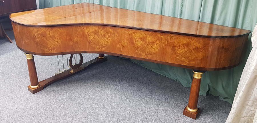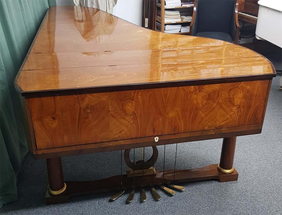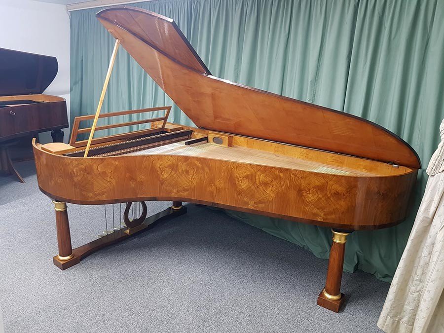 Länge 235cm, Oberfläche Ulme Maser, Tonumfang 6 ½ Oktaven (78 Tasten, C1 bis f4), Tastenbelag aus Knochen, Prellzugenmechanik (Wiener Mechanik), Tonhöhe 440 Hz, 6 Pedal e: Una Corda (Verschiebung), Fagottzug, Forte (Dämpfungsaufhebung), Moderator (2 Pedale mit gleicher Funktion), Janitscharenzug