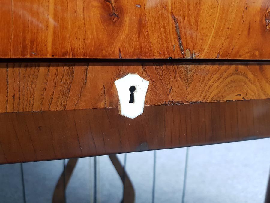 Die Original Schellackoberfläche war sehr gut erhalten und diente als Grundierung. (Es ist nicht nachvollziehbar ob es sich um die erste Politur handelt)