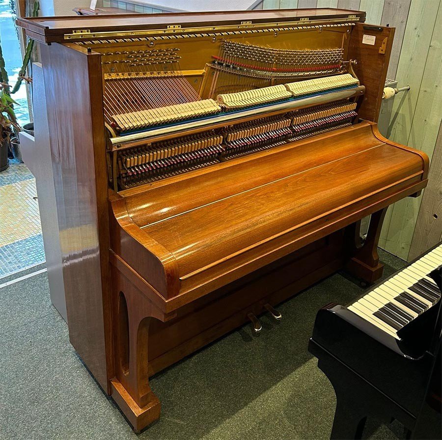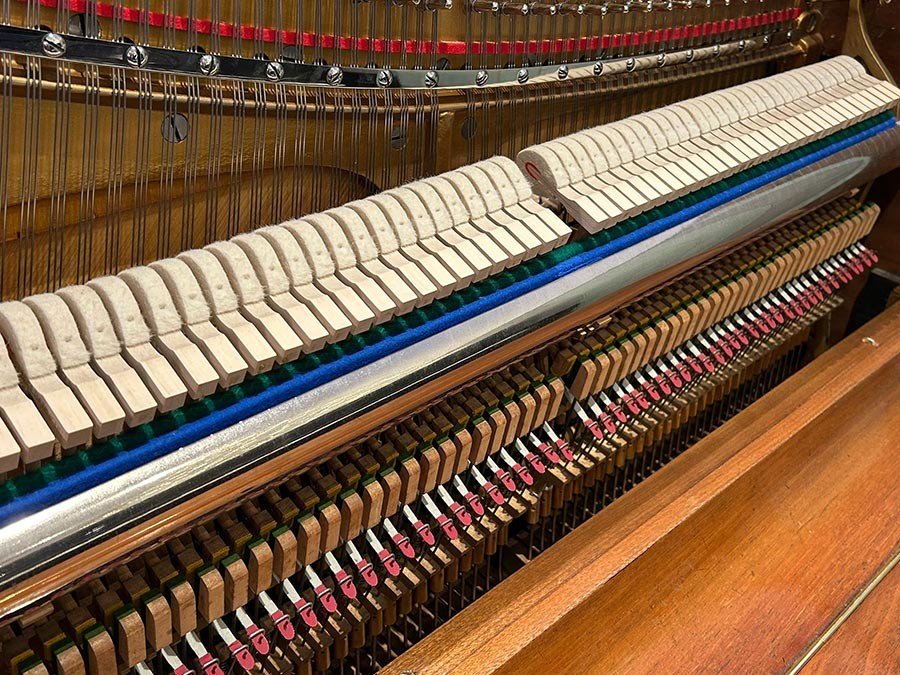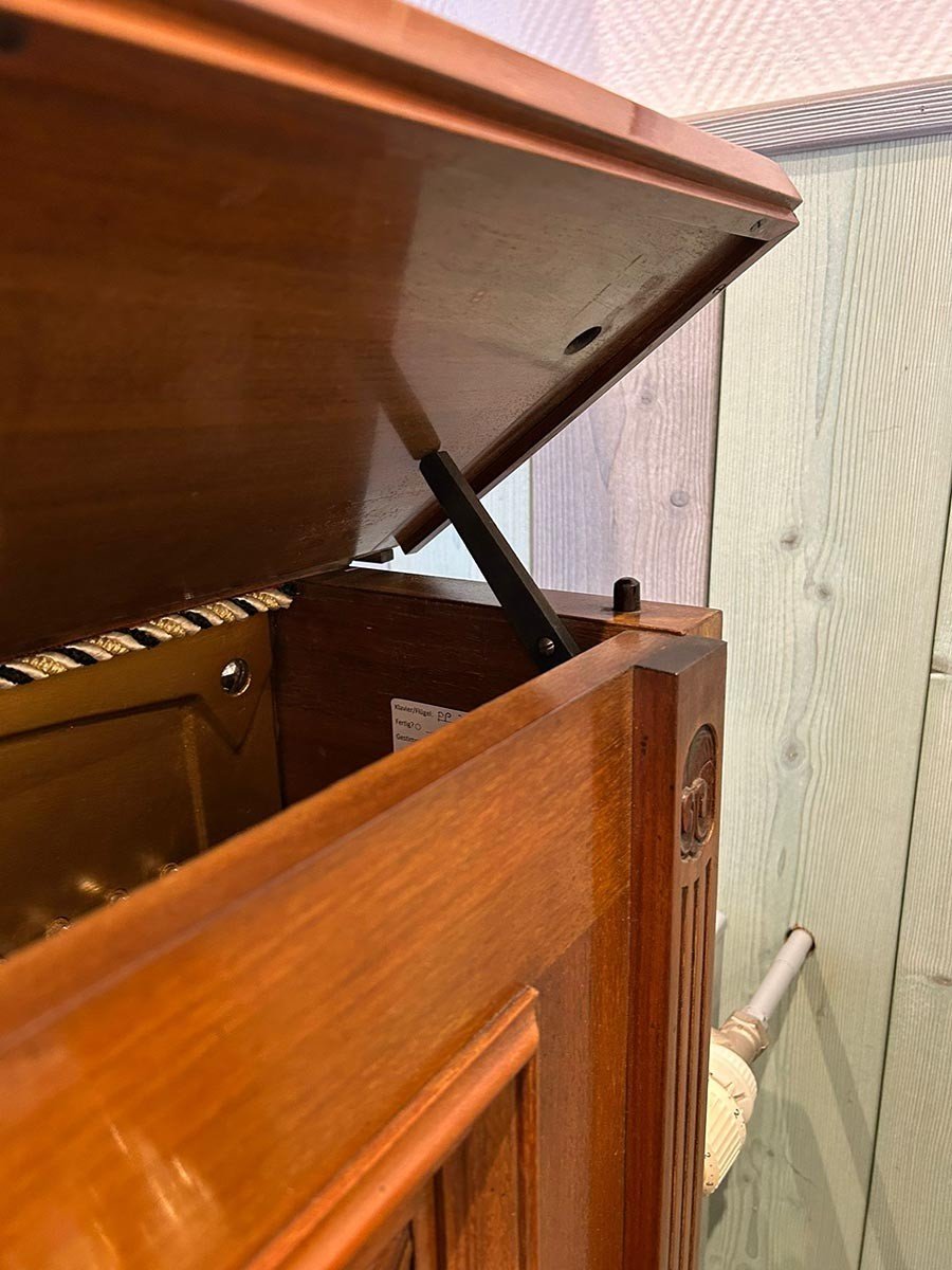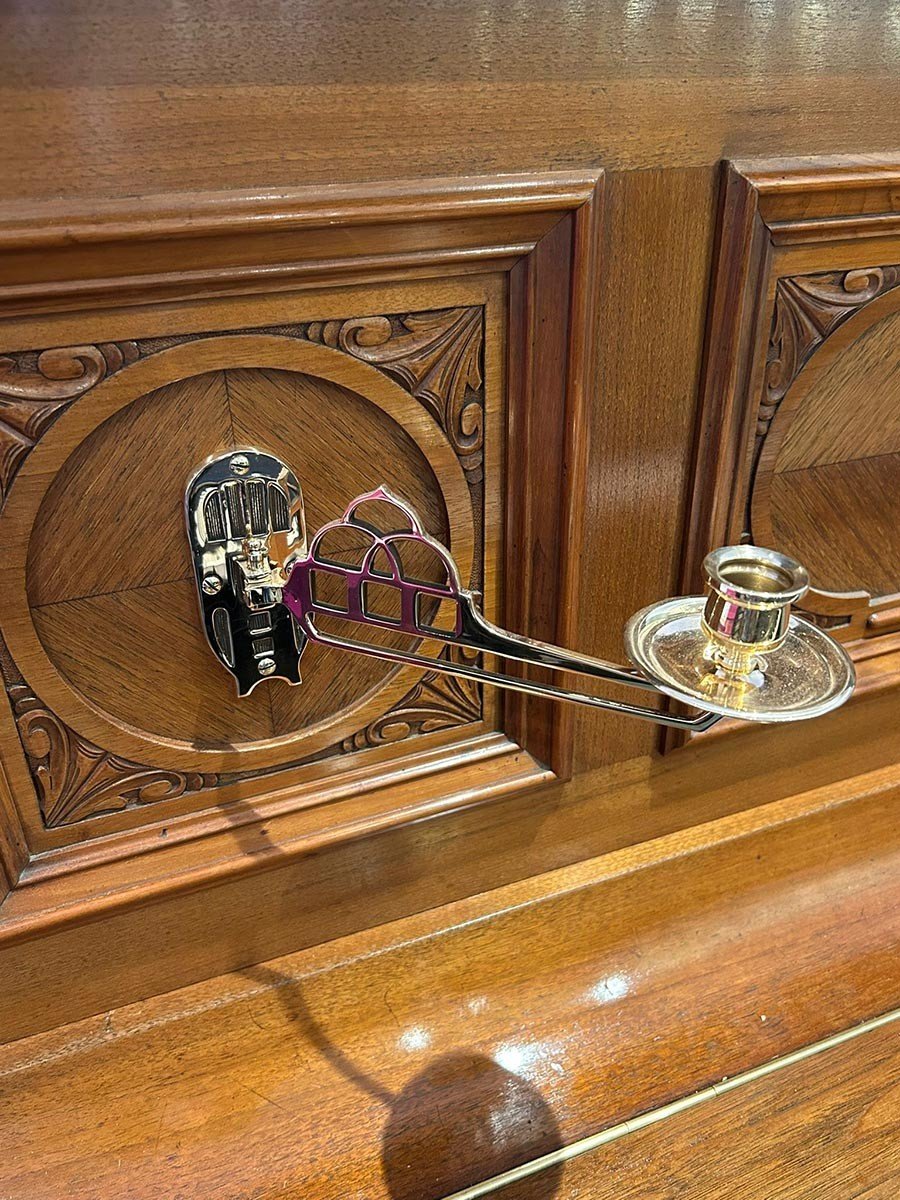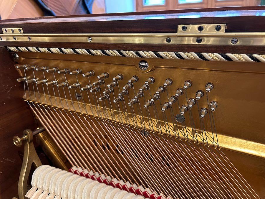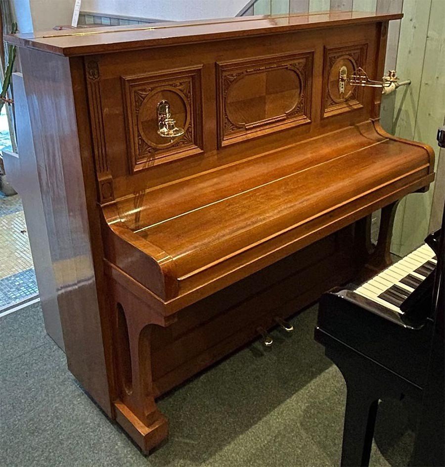 In unserer Fachwerkstatt wurde dieses wunderschöne Jugendstil-Klavier einer umfassenden Überholung der akustischen Anlage unterzogen. Der Resonanzboden wurde ausgespänt und sorgfältig geschliffen und neu lackiert, während die Gußplatte nun in einem eleganten Gold matt erstrahlt. Zudem haben wir neue Stimmwirbel eingesetzt und sowohl im Bass- als auch im Diskantbereich neue Saiten aufgezogen. Im Rahmen der Mechaniküberholung wurden die Hammerköpfe und Dämpfer ausgetauscht, die Dämpfung komplett neu gesetzt sowie Gegenfängerleder und Bändchen erneuert. Für ein optimales Spielgefühl haben wir nicht nur die Mechanik und Klaviatur präzise reguliert, sondern auch die Vorder- und Waagebalkengarnierungen ausgewechselt. Die Klaviatur wurde mit neuen weißen Tastenbelägen belegt, der Klaviaturrahmen gründlich gereinigt und die Klaviaturrahmenfilze ersetzt. Neue Pilotenpolster wurden eingeleimt, und das Spielgewicht der Tasten ist erneut ausgewogen worden. Auch an der Pedalanlage haben wir verschiedene Arbeiten durchgeführt, indem wir Filze und Leder erneuert haben. Zum Abschluss wurde das Instrument sorgfältig gestimmt und fachmännisch intoniert, um den Klang in voller Pracht zur Geltung zu bringen. Wir haben zudem Arbeiten am Gehäuse vorgenommen, indem der Schellack aufgefrischt und diverse Schäden am Furnier repariert wurden. Da die ursprünglichen Leuchter vermutlich schon während des Zweiten Weltkriegs entfernt worden waren, haben wir sie durch stilgerechte, antike Leuchter ersetzt. |