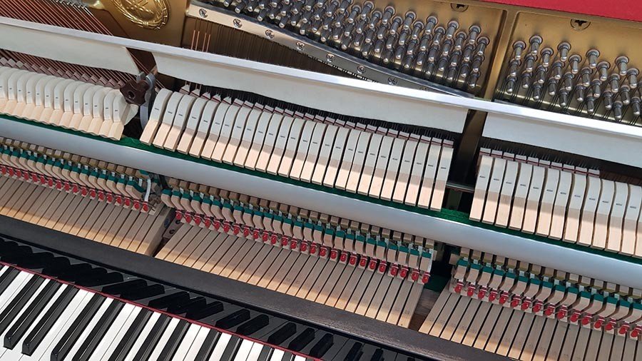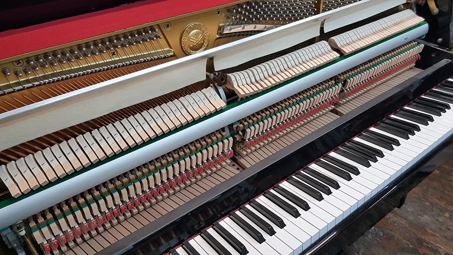 In unserer Fachwerkstatt wurden die Hammerköpfe sorgfältig abgezogen und die Mechanik umfassend reguliert. Das schwarze Polyester Gehäuse, die Tasten, sowie alle Messingteile sind poliert worden. |